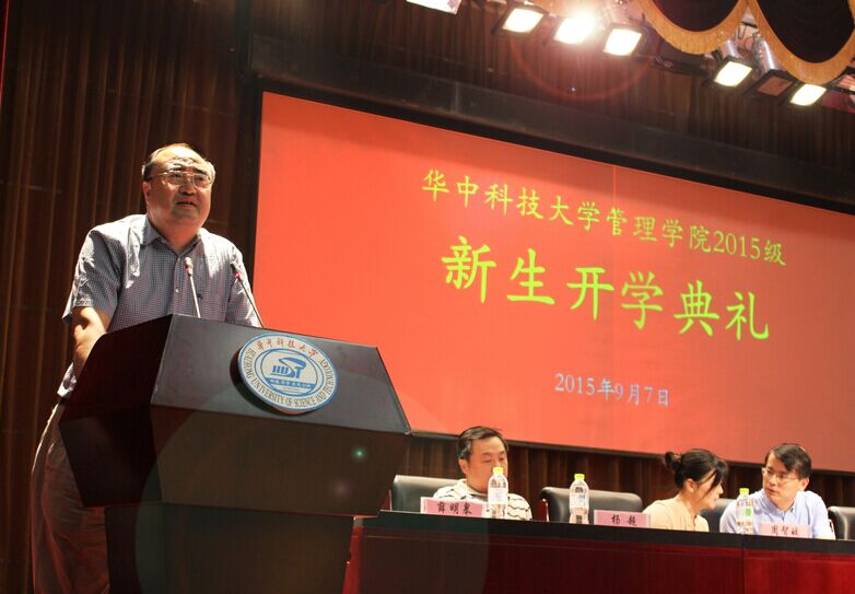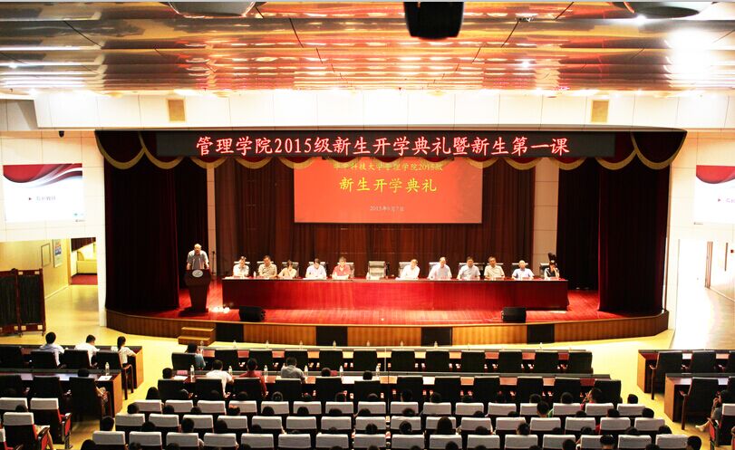 主持人毛家兵做总结陈词,表达了我院对2015届新生的欢迎和希冀,此次开学典礼圆满结束。随后,我院副院长分别在管院报告厅、206多功能厅为本科、研究生做入学教育。