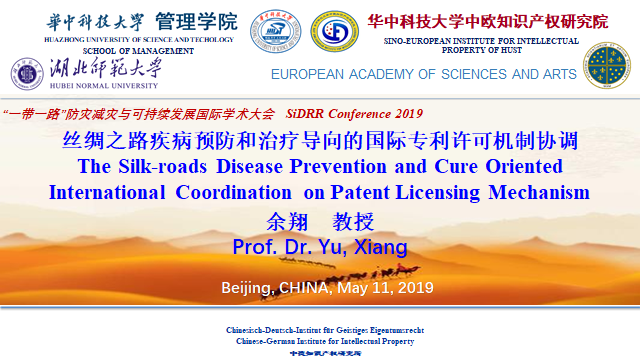 (通讯员 倪佳豪)5月11至12日,由中国科学院、联合国环境署(UNEP)和国际科学组织联盟(ANSO)等联合主办的“一带一路”防灾减灾与可持续发展国际学术大会在北京召开。中科院白春礼院长、联合国助理秘书长水岛真美女士、联合国环境署及减灾办公室官员代表、中国生态与环境部黄润秋副部长等致开幕词,来自世界多国科学院的院士、专家学者在会议上作了多视角、精彩纷呈的学术报告,共有来自40多个国家的700多名代表参加了会议。qy千亿球友会中欧知识产权研究院院长、qy千亿球友会中德知识产权研究所所长余翔教授应邀参会,作为qy千亿球友会、湖北师范大学和欧洲自然科学与社会科学院的代表,作了题为“丝绸之路疾病预防和治疗导向的国际专利许可机制协调”的报告。