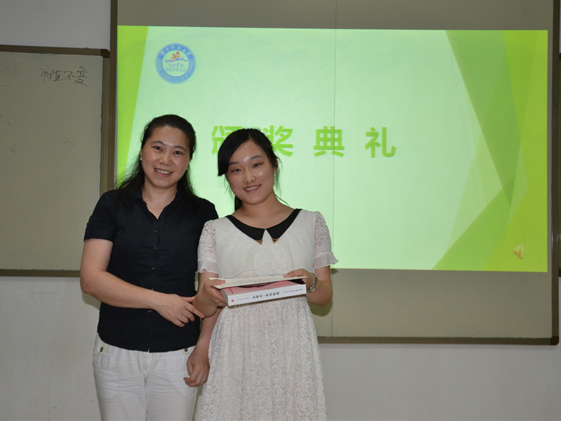 方凌云老师(左一)为一等奖获得者阮泽慧(左二)颁奖