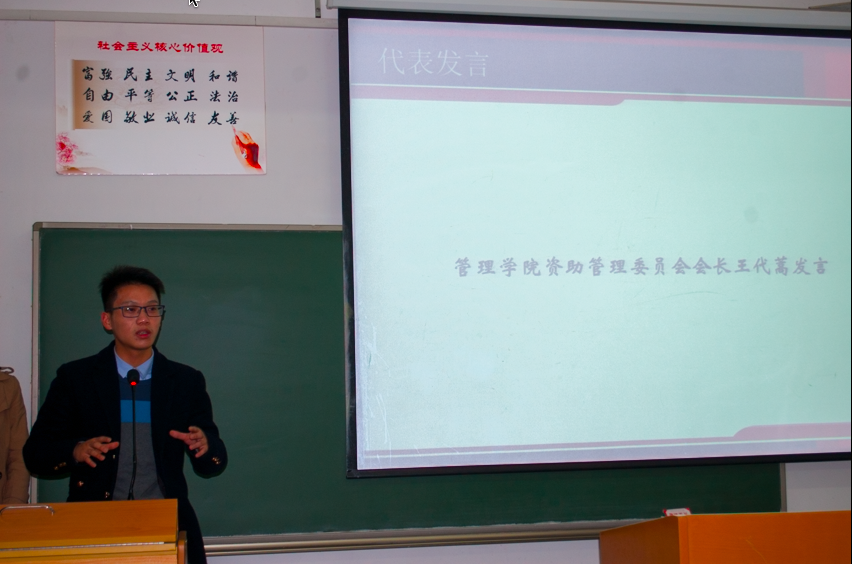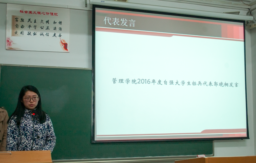 接着,2016年度自强标兵郭晓桐分享了属于她的自强标兵经历——前往甘肃大平山支教。那段时间,无论心理还是生理上,她都遇见了完全不同于平常的困难,但是她依旧喜悦于收获与孩子们深厚的感情。支教很普通,但三次不间断地前往,同一个地方、同一批孩子、同一门课程,一次次全力以赴的完成才是真正的“平凡中发现伟大”。之后,王代蒿发表了讲话,他认为自强标兵的评选不在于自己有多么优秀,经历有多么独特,而是在于如何展现自己的优秀,随后他表示,学院会全力支持本次自强标兵进行校级自强标兵的评选,并对我院能够成功评选出一名校级自强标兵表示了热烈的期待。