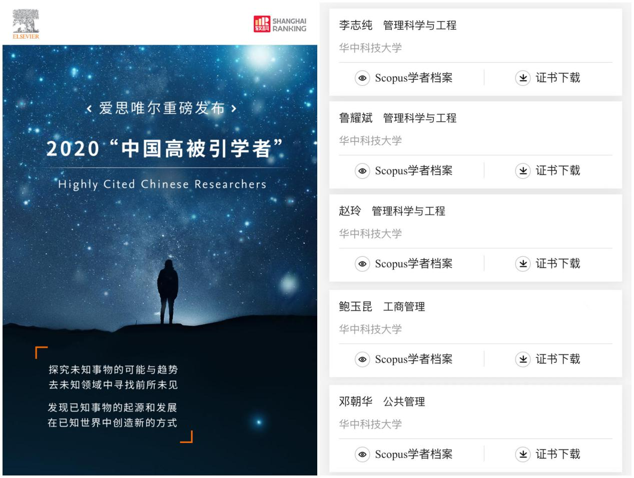 2021年4月22日,全球性信息分析公司爱思唯尔(Elsevier) 正式发布了2020年中国高被引学者榜单,我校共有77名学者上榜。其中,我院鲁耀斌教授、李志纯教授、赵玲副教授入选管理科学与工程领域榜单,鲍玉昆教授入选工商管理领域榜单,邓朝华教授入选公共管理领域榜单。