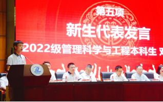 新生代表,管理科学与工程类2201班邓扬帆号召全体新生,以实际行动让“学在华科大”的名片更加响亮,在学习与探索中找到人生方向;以实际行动展现更为坚毅自强的qy千亿球友会学子形象,迎接一切困难和挑战,“欣逢盛世,当不负盛世”。