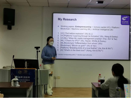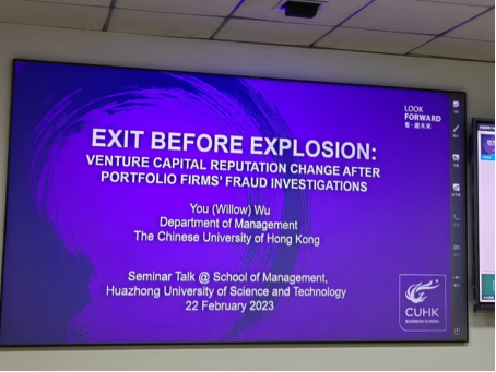 2月22日上午,喻园管理论坛2023年第4期(总第827期)在管理大楼110教室顺利举行。香港中文大学商学院助理教授吴悠以“被投公司接受欺诈调查后风险投资机构的声誉变化”为主题做学术分享,并与参会人员进行了交流探讨。本次论坛由qy千亿球友会创新创业与知识产权系买忆媛教授主持。