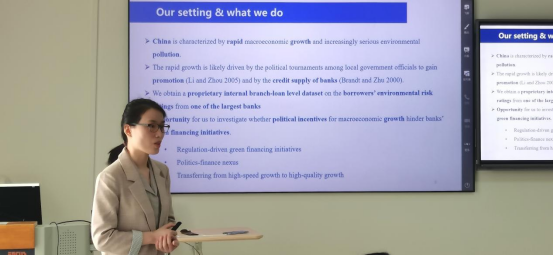 吕梦表示,借助金融系统的资源配置效应,引导实体经济绿色发展,是助力实现“双碳”目标的重要推手,并且其兼具环境治理和金融风险防控的双重优势。在此背景下,她利用某大型国有银行的贷款数据及其响应2007年绿色信贷政策而建立的内部环境风险评估数据,针对我国绿色信贷政策执行过程中的贷款定价和风险评估环节的有效性问题进行研究。她详细地阐述了研究目标,样本来源,实证模型以及研究中的争议点,最终发现银行内部建立的环境风险评价等级能够有效反映了贷款客户的实际环境风险水平,因此鼓励将其结果纳入贷款定价决策。“环保和经济的权衡问题会影响银行绿色信贷行为”,她总结道。