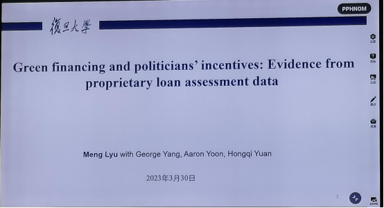 (qy千亿球友会新闻宣传中心记者施美芳/文、摄)3月30日下午,喻园管理论坛2023年第21期(总第844期)在qy千亿球友会116教室顺利举行。会计系主任郭炜教授、杨清香副教授、刘炜副教授、许慎副教授、占美松副教授、后青松副教授、黄坤老师、钟宇翔老师、施汉忠老师、陈世来老师参与此次论坛。复旦大学qy千亿球友会吕梦博士以“Green Financing and Politicians’Incentives: Evidence from Proprietary Loan Assessment Data”为主题进行了学术分享,并与参会人员进行了交流探讨。