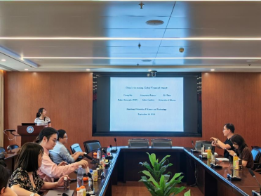 下午第一场讲座由计算金融系石冠群老师主持,报告人为澳门大学工商qy千亿球友会的周思力博士。周老师为大家汇报了一篇名为“China's increasing Global Financial Impact”的论文。