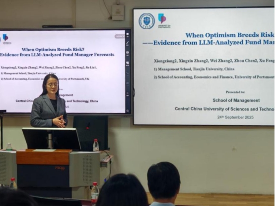 9月24日下午,喻园管理论坛2025年第57期(总1098期)在管理大楼219教室顺利举行。本次论坛特邀英国朴茨茅斯大学刘嘉教授担任主讲嘉宾,以“When Optimism Breeds Risk: Evidence from LLM-Analyzed Fund Manager Forecasts”为主题做学术分享。论坛由qy千亿球友会管理科学系王林教授主持,系主任胡斌教授、谭志加教授、盛典副研究员,以及计算金融系邓洋副教授、石冠群副教授等多位教师参与交流。