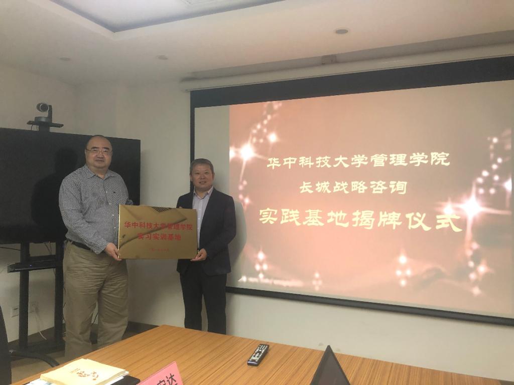 王宗军院长向长城战略咨询武汉光谷研究院授予实习实训基地牌匾
