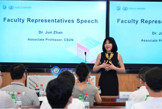 美方项目负责人,授课教师代表詹俊首先表达了对学员们的热烈欢迎,接着向在场来宾介绍了本次参加暑期学校的17位学员。她表示,我们正在踏上梦想的旅程,而“梦想”旨在培养中美之间人与人的交流,以弥合两国经济和政治差异,以及促进年轻一代之间文化与教育的交流。本次暑期学校项目的成功举办离不开两校的积极沟通与互相扶持。最后她期待本次暑期学校的学员们能够在本次学习中积极与同行们交流想法,真正结交到一些朋友,建立持久的友谊与合作,度过一个富有成效和愉快的夏天。
