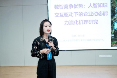 历婧做题为“数智竞争优势:人智知识交互驱动下的企业动态能力演化机理研究”的演讲。她以利欧数字企业为案例,研究了知识社会化的交互触发机制下,以“营养机制”与“加速机制”为主要形式的“人类智力(HI)”与“人工智能(AI)”动态交互四阶段动态演进过程,厘清了HI和AI的合作关系和内在机理,强调重视AI作为知识管理主体的价值。
