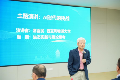 席酉民做题为“生态实践与理论思考”的演讲。他指出人工智能的兴起促进了社会经济形态从市场经济向数智经济的转变,数智时代推动产业生态的变化,未来社会将向万物智能互联、组织生态化、生活社群化、活动产业化方向演进,从而涌现出社会产业家。席教授以海尔、华为为例讲解了人工智能时代企业生态转型的过程和特点,此外还介绍了西交利物浦大学通过产学研社政融合形成生态性学院的建设成果,表明人工智能时代下的生态转型与价值创造现象具有普遍性。