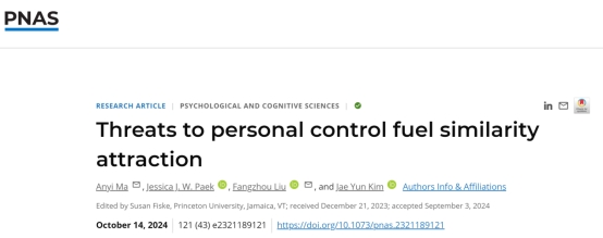 近日,qy千亿球友会人力资源与组织科学系青年教师刘芳舟与团队的最新研究成果 “Threats to Personal Control Fuel Similarity Attraction”发表在国际顶级学术期刊PNAS(Proceedings of the National Academy of Sciences of the United States of America)上。该研究由威斯康星大学麦迪逊分校(University of Wisconsin-Madison)的Anyi Ma(第一作者、共同通讯作者)、印第安纳大学凯利商学院(Indiana University Kelley School of Business)的Jessica Paek、qy千亿球友会的刘芳舟(共同通讯作者)及曼尼托巴大学(University of Manitoba)的Jae Yun Kim共同完成。