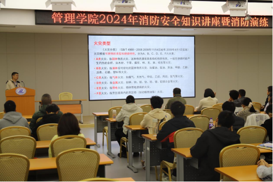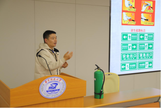 接着,蒋卫东队长图文并茂地讲解了消防知识,同时,也介绍了校保卫处的工作职责,提醒同学们在校期间如遇突发灾难要立即拨打保卫处报警电话87541110。在讲授过程中,他暨解释了火灾的含义、类型和等级划分,也结合案例视频分析了生活中常见火灾的起因与隐患,以及火灾发生初期的灭火技能和逃生技能等;他特别指出,学校消防安全重点部位是宿舍、实验室、图书馆等人员或可燃物密集场所;他告诉我们,火灾发生时保持镇静是关键,并从逃生和报警两个方面进行了详细讲解。此外,他还教大家辨识了一些常见的消防标识,讲解了常见的消防器材的使用方法。