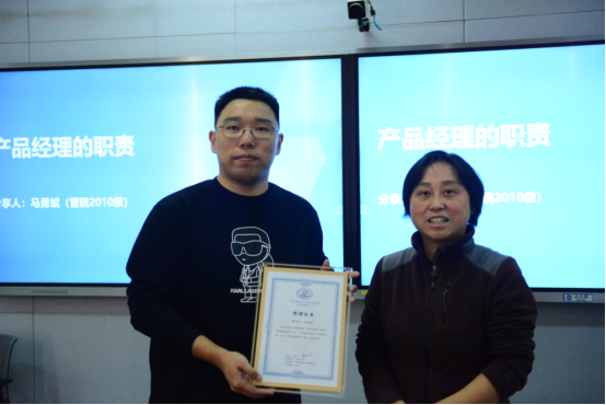 首先,马勇斌先生分享了产品的价值判断、产品的具体定义、调动资源以实现产品目标的方法。紧接着阐述了产品经理的职责,并从具体职责、通用职责和个体职责三个不同的层面进行了分析。此外,他还提出了产品经理的能力模型,强调了担任这一角色所需要的知识体系。然后,马勇斌先生以小组为单位给同学们布置了题为“为公司制定最优产品方案”任务进行讨论,学生们通过模拟真实场景履行产品经理的角色,深入参与到案例讨论中。最后,课程以复盘与总结的形式结束。课堂被巧妙地划分为三个部分的结构设计旨在通过理论讲解、实践应用和反思巩固,全面提升学生的学习体验。马勇斌先生的分享,使同学们对企业中产品经理的职责有了更深入的理解。在热烈的掌声中贺远琼教授为主讲人颁发了授课证书,感谢并表彰主讲人的辛勤付出和专业分享。