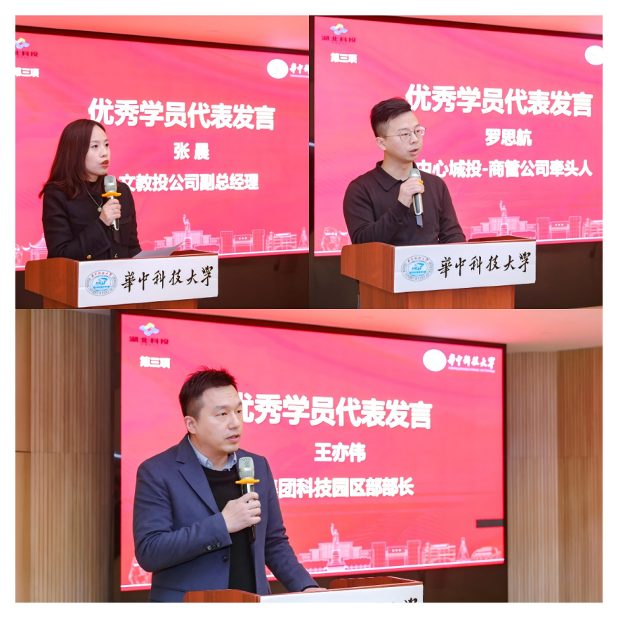 湖北科投科技园区部部长王亦伟、文教投公司副总经理张晨、中心城投商管公司牵头人罗思航三位优秀学员代表依次上台发言,分享他们在研修班中的深刻收获与体会。三位代表言辞真挚,展现了本次研修班课程对学员们思维模式和实践能力的深度启发,引发了在场学员的强烈共鸣。