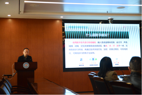 刘俊以“数字教材建设及平台应用”为主题进行了分享,从政策解读、出版社优势、数字教材建设思路、一系列的应用案例等进行详细讲解。刘俊表示所谓数字教材是使用数字技术进行系统编排,融入各类富媒体资源,由文字、声音、视频、动画、交互等各类资源呈现,集教、学、评、测于一体,支持各类学习终端,通过技术手段打包、加密、封装后,可在线发行、可离线学习的电子出版物。