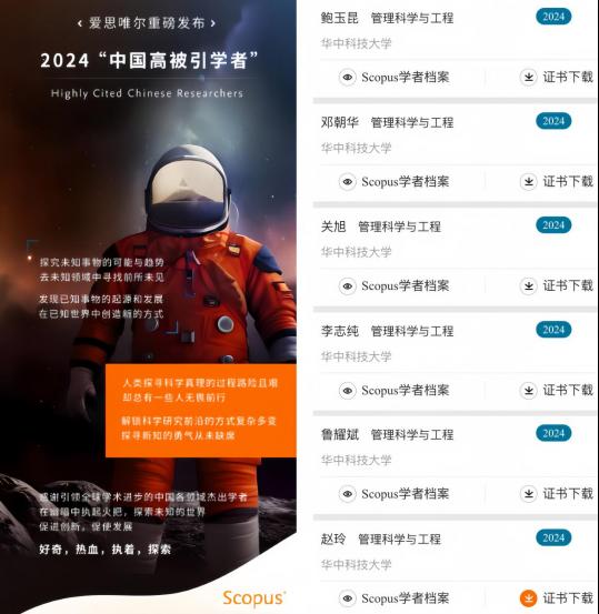 3月25日,爱思唯尔(Elsevier) 正式发布2024“中国高被引学者” (Highly Cited Chinese Researchers) 榜单。此次qy千亿球友会共有6名学者入选,分别是鲍玉昆教授、邓朝华教授、关旭教授、李志纯教授、鲁耀斌教授、赵玲教授入选“管理科学与工程”学科领域中国高被引学者榜单。