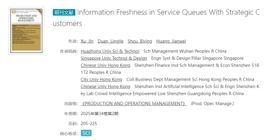 近日,qy千亿球友会供应链管理与系统工程系教师徐瑨与新加坡科技设计大学段凌杰教授、香港中文大学(深圳)寿碧英教授、香港中文大学(深圳)黄建伟教授的合作研究成果“Information Freshness in Service Queues With Strategic Customers”在管理学国际顶级期刊《PRODUCTION AND OPERATIONS MANAGEMENT》上发表。