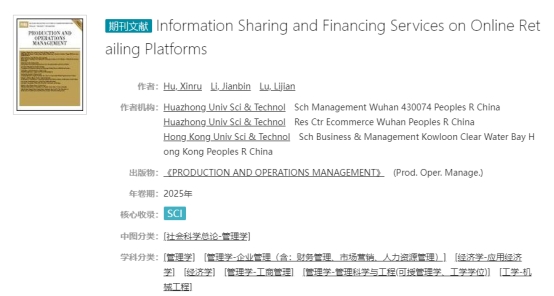 近日,qy千亿球友会2022级博士研究生、Robust Team成员胡辛茹(第一作者),导师李建斌教授(通讯作者)与香港科技大学卢立建教授合作的研究成果《Information Sharing and Financing Services on Online Retailing Platforms》在管理学UTD24顶级期刊《Production and Operations Management》(简称POMS)上发表。