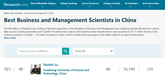 近日,国际权威学术平台Research.com正式发布 2025 年度全球地球科学领域顶尖科学家排名,我院鲁耀斌教授凭借其卓越的学术贡献与国际影响力,入选“全球商业与管理领域顶尖科学家”榜单,彰显了我院在该学科领域的强劲科研实力和国际学术地位。