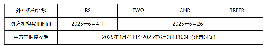科学基金网络信息系统在线申报接收期以及相应外方资助机构规定的截止时间如下表所示。请申请人注意提醒外方合作者在相应的截止时间前提交申请。