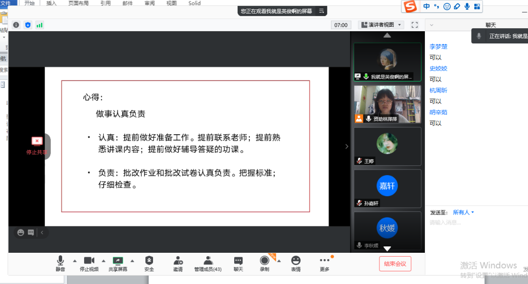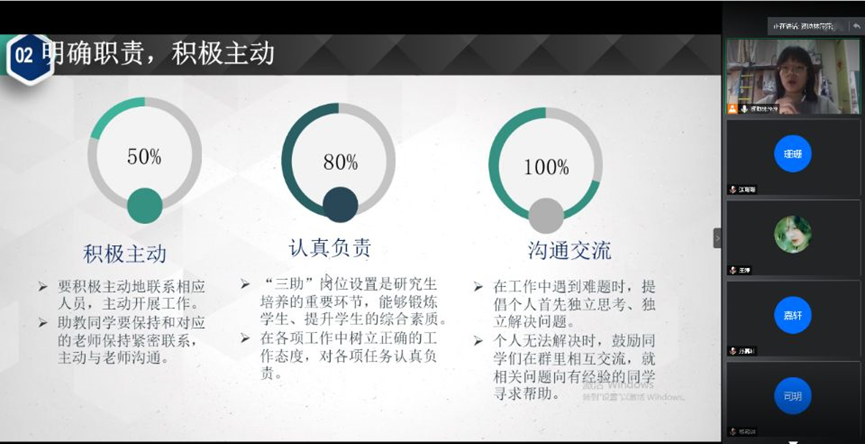 为落实资助育人要求,做好三助工作,2020年12月11日下午,qy千亿球友会2020年秋季研究生助理培训交流会通过腾讯会议在线上开展。培训会由学院资助德育助理林萍萍主持,全体研究生助理参加培训。