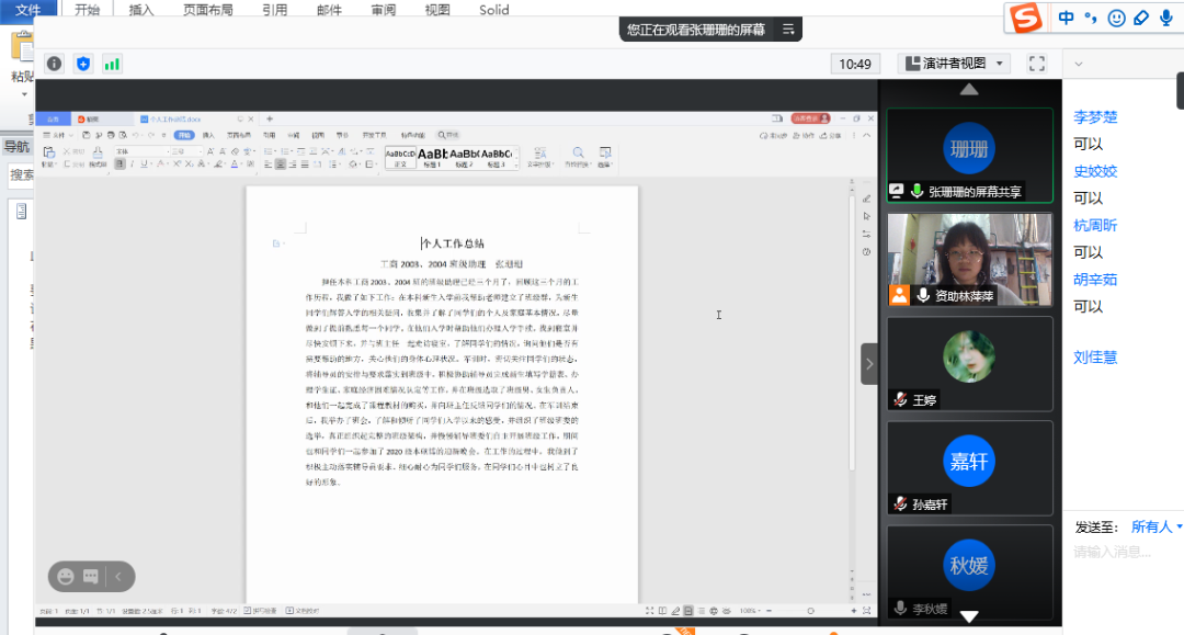 工商管理大类2003班、2004班班助张珊珊同学立足个人的班助工作,向同学们分享了班助工作的主要内容和工作方法。张珊珊认为,班助的主要职责在于协助本科班主任、年级辅导员管理班级事务、参与班级学生培养工作,这要求班助在开展工作的过程中重视工作方法。需要以诚待人发挥班助对本科学生的正向引导作用,树立良好的榜样。