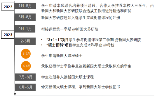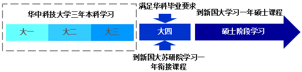 “3+1+1”项目针对华科管院相关专业优秀的本科学生,制定了3年国内大学本科,1年衔接课程和1年硕士课程的学习模式。华科管院学生在完成学院相关专业前三年本科学习后,可申请新国大苏研院一年制衔接课程,衔接课程完成并同时满足华科毕业要求并顺利毕业后,可申请新国大工业系统工程与管理系一年制课程硕士。